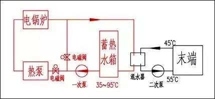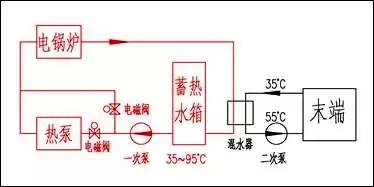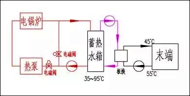 在晚間谷電價的時間段中,空氣源熱泵機(jī)組把蓄熱水箱的水溫從35℃提升到50℃,電鍋爐再把水溫提升到95℃。