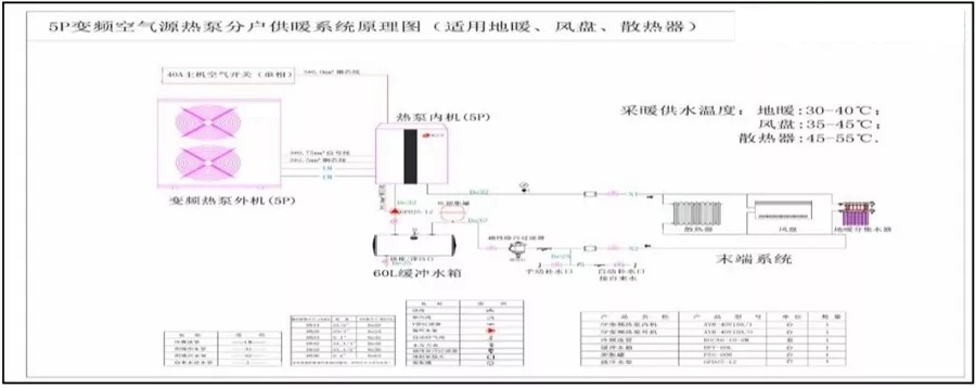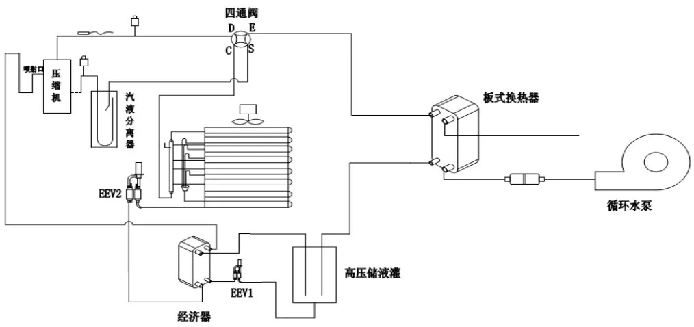 由上表可知北京延慶地區(qū)120平方米的農(nóng)村居民常用戶型采暖所需熱負(fù)荷約為7.5KW,室外環(huán)境溫度為-12℃時,其制熱量約為8.65KWd的EVI變頻變水溫機組,額定制熱輸入功率為3.73KW,冬季可在-25℃的環(huán)境中正常供暖,確保山區(qū)農(nóng)戶冬季采暖需求。系統(tǒng)原理圖:
