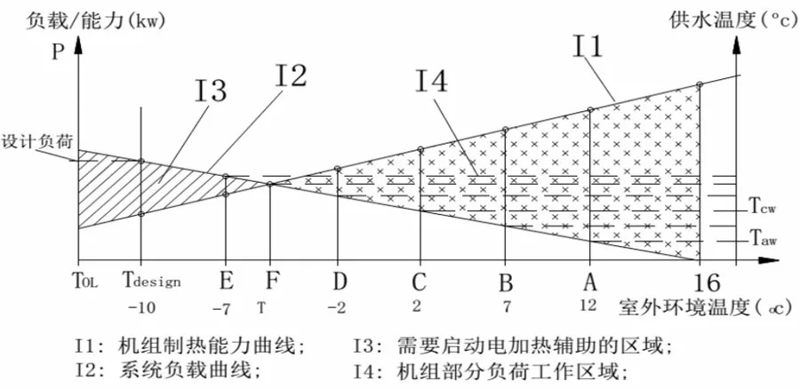 在熱泵供暖系統(tǒng)里面,調(diào)節(jié)供水溫度是最有效率的控制方式,如上節(jié)中所舉的臺機器的試驗參數(shù)所顯示的,供水溫度對熱泵的COP有明顯影響,供水溫度越高,COP越低,從上面的數(shù)據(jù)看,溫度每升高1度,COP下降約2%;下圖,是空氣源熱泵制熱能力和建筑物所需負(fù)載在不同環(huán)溫下,對比變化的一對交叉曲線,在80%以上的時間,機組工作在部分負(fù)荷狀態(tài),變頻變水溫機組,在如下幾個因素上,能大幅提高機器的綜和季節(jié)能效比SCOP: