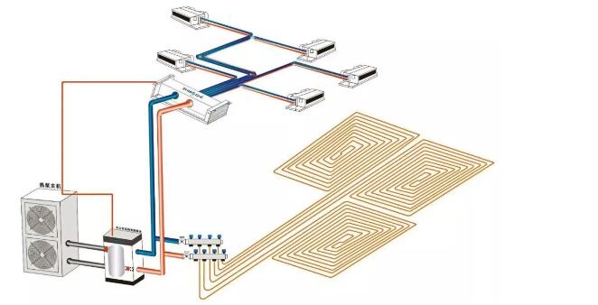 除了提供供暖,空氣源熱泵還有兩聯(lián)供機(jī)組。末端系統(tǒng)采用輻射盤(pán)管和風(fēng)機(jī)盤(pán)管,全部室內(nèi)以水為換熱媒介,夏季供冷水,直接采用低溫水送到風(fēng)機(jī)盤(pán)管進(jìn)行制冷。冬季供熱水,從室外機(jī)直接提供45℃左右熱水供地板采暖。該系統(tǒng)配合緩沖水箱二次系統(tǒng)的穩(wěn)定性和地暖良好的熱穩(wěn)定性,系統(tǒng)整體穩(wěn)定性較高。代替了傳統(tǒng)的“中央空調(diào)制冷+壁掛爐采暖”的家居模式。