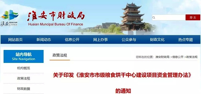 2018年7月2日,淮安市財(cái)政局、市農(nóng)機(jī)局聯(lián)合印發(fā)《淮安市市級(jí)糧食烘干中心建設(shè)項(xiàng)目資金管理辦法》,支持項(xiàng)目資金采取先建后補(bǔ)支持方式,每個(gè)烘干中心補(bǔ)助額不超過(guò)10萬(wàn)元。原則上同一主體已享受過(guò)市級(jí)財(cái)政烘干中心建設(shè)項(xiàng)目資金補(bǔ)助的不再支持。