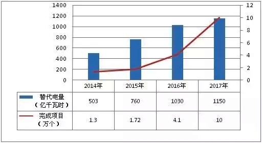 2014年,國網公司系統大力推進“以電代煤、以電代油,電從遠方來,來的是清潔電”戰略,累計實施電能替代項目1.3萬余個、替代電量503億千瓦時,為促進節能減排做出了貢獻。