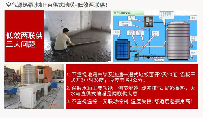 其次,導致對兩聯供技術不成熟的誤解原因:不重視地暖末端及流速、誤認為水箱的主要功能是蓄熱而非降低流速、不重視聯動溫控等造成的。