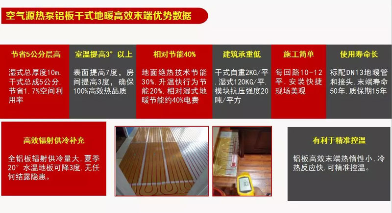 其中,系統標配:1)全鋁板干式地暖模塊;2)分水器;3)DN13地暖管;4)專用接頭。這里我做了一個空氣源熱泵鋁板干式地暖高效末端優勢數據圖,這個很寶貴,具體優勢大家可以看下圖: