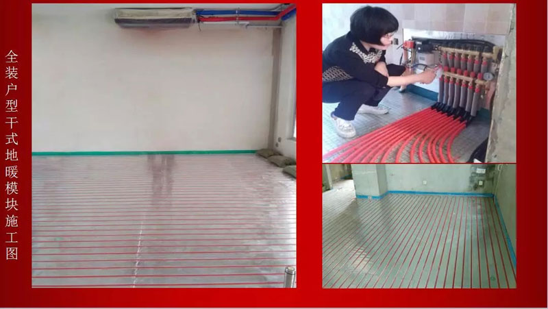 混裝戶型采用二次分水器、局部保護、水電聯動、地磚后貼四種過管工藝。地磚區模塊在貼磚前鋪設,可與主管道一并施工;地板區模塊在鋪地板前鋪設,與主機一并施工;不用水泥回填干式地暖施工配合相對更簡單!