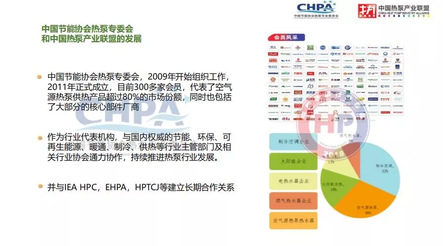 中國熱泵產業(yè)聯盟于2009年開始在我國熱泵行業(yè)組織與空氣源熱泵產業(yè)相關的工作,2014年8月正式通過民政部批準,注冊為中國節(jié)能協會熱泵專委會,是中國節(jié)能協會下設分支機構之一。目前協會具有300多家會員,代表了空氣源熱泵供熱產品超過80%的市場份額,同時也包括了大部分核心部件廠商。中國節(jié)能協會熱泵專業(yè)委員會作為行業(yè)代表機構,與國內權威的節(jié)能、環(huán)保、可再生能源、暖通、制冷、供熱等行業(yè)政府主管部門及相關行業(yè)協會通力協作,持續(xù)推進熱泵行業(yè)的發(fā)展。與此同時,專委會還與IEA HPC、EHPA、HPTCJ等國際產業(yè)機構建立長期合作關系。