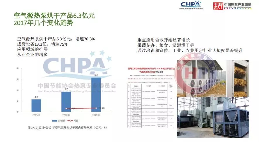 此外,近兩年生活熱水、供暖和工農業(yè)烘干三大應用領域在市場總量中所占的市場份額也發(fā)生變化。在供暖市場興起前,生活熱水一直占據年度產業(yè)總體規(guī)模的最大市場份額,但是2017年空氣源熱泵供暖(包括戶式和商用)產值達到90.4億元,占行業(yè)比例達到52.8%,開始占據最大份額。在空氣源熱泵供熱產品應用領域增幅方面也出現了變化,2017年生活熱水增幅最小為2.9%,供暖增長達到221.7%,烘干達到70.3%。2017年工農業(yè)烘干主機出貨額是6.3億,增速70.3%,成套設備算上烘房,成套設備市場規(guī)模實現13.2億,增速75%。此外烘干市場出現應用領域的擴展,從業(yè)企業(yè)的增多的特點。一些重點應用領域開始顯著增長,包括花卉、糧食、以及玉米烘干等。行業(yè)協會也正積極通過持續(xù)宣傳培訓來提升工業(yè)和農業(yè)用戶對于空氣源熱泵的認知度。