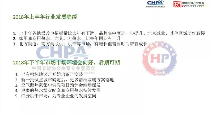 2017年我國空氣源熱泵供熱產業(yè)取得非常好的成績,但是在2018年上半年行業(yè)發(fā)展趨緩,整機制造企業(yè)壓力非常大,源于2018年上半年煤改電的招標總量與去年相比有所下降,品牌的集中度迅速提高。具體北京地區(qū)冬季清潔取暖工程空氣源熱泵產品市場需求量比去年有所降低,河北、山東、山西等其他區(qū)域工作開展比較慢,且市場比較分散,給空氣源熱泵整機企業(yè)帶來非常大的壓力。但2018年后半年市場環(huán)境會向好,市場前景依然可期。尤其是北方地區(qū)清潔取暖新一批試點城市公布之后,更多的清潔取暖方案將落地。此外,空氣源熱泵集中供暖項目在2018年后半年也將迎來市場旺季,集中供暖市場將為商用低溫空氣源熱泵機組等產品帶來市場會在后半年持續(xù)爆發(fā)。在生活熱水領域,越來越多的精裝樓盤選擇使用空氣源熱泵產品實現生活熱水的配套,還有就是細分的烘干市場,如淤泥、煙業(yè)的烘干市場都將為專業(yè)空氣源熱泵企業(yè)提供良好的細分的發(fā)展空間。