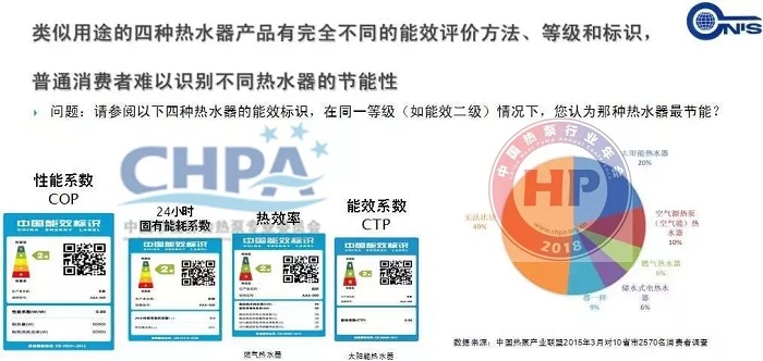 依據國家能效標準,我國已經實施了燃氣熱水器、電熱水器、太陽能熱水器和熱泵熱水器的能效標識,但類似用途的四種熱水器產品有完全不同的能效評價方法、等級和標識,普通消費者難以識別不同熱水器的節能性。根據2015年中國熱泵產業聯盟針對消費者調查,49%的消費者表示只觀察同樣標注了2級的四種產品的標識,無法比較哪一個產品更節能。