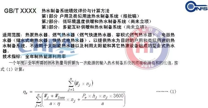 經過了多次征求意見,目前團體標準已經形成了送審稿,標準的名稱是T/CECA XXXX-XXXX《家用和類似用途熱水器能效測試計算方法》,適用范圍包括熱泵熱水器、燃氣熱水器(燃氣快速熱水器、容積式燃氣熱水器)、電器熱水器(儲水式電熱水器、快熱式電熱水器),以提供熱水為目的的戶用和類似用途的熱水制備系統。由于太陽能熱水器測試方法的復雜性,暫時不適用于太陽能熱水器以及利用太陽能和其它熱源設備組成的復合式熱水器。