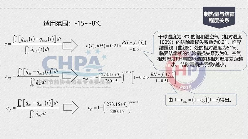 在-15℃到-8℃數(shù)學(xué)模式的圖上可以看到,結(jié)霜的損失系數(shù)用一個(gè)符號(hào)來(lái)代表,結(jié)霜的損失一定影響了它的名義制熱量,所以,它有一個(gè)損失系數(shù),會(huì)影響到整個(gè)制熱量的衰減。有了數(shù)學(xué)模型就可用進(jìn)行數(shù)學(xué)計(jì)算,去解決這樣的物理現(xiàn)象。