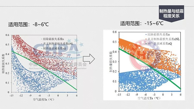在這個(gè)因子的確定上,我們對(duì)國(guó)內(nèi)有影響的廠家生產(chǎn)的熱泵機(jī)組進(jìn)行了數(shù)學(xué)上面的處理;其環(huán)境因子的值在一般情況下,指數(shù)是5.65,建立了這個(gè)數(shù)學(xué)模型。同時(shí),對(duì)于除霜的問(wèn)題,結(jié)霜是逐步的增厚,厚到一定的程度影響其換熱。為此,我們要求一定要通過(guò)除霜進(jìn)行試驗(yàn)。此時(shí),除霜是消耗其它的能量。