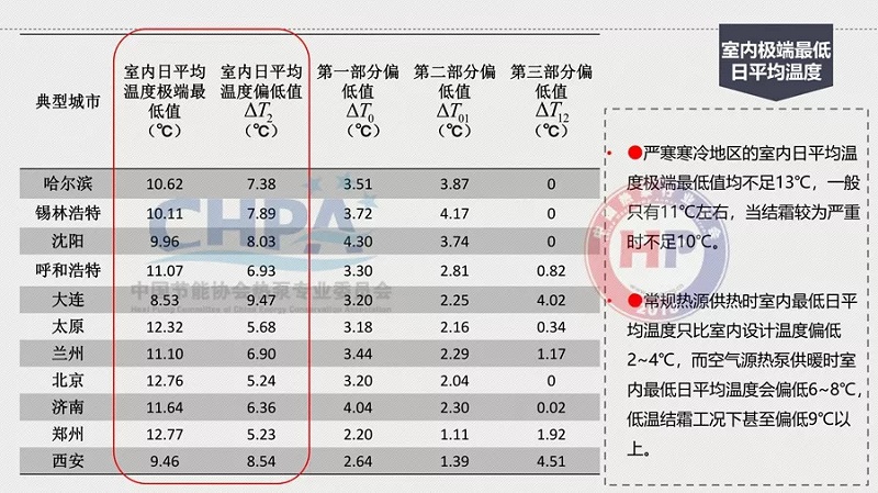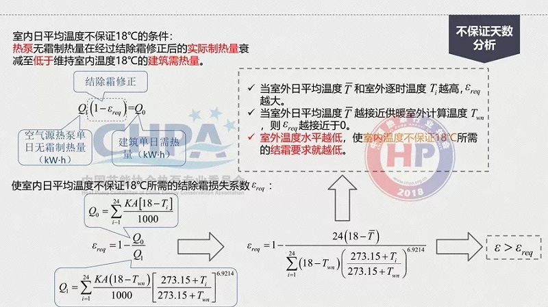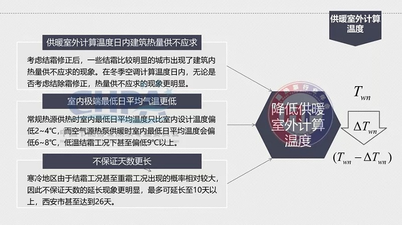 那么,怎么由18℃降到13℃?原因是在統(tǒng)計(jì)規(guī)定室外計(jì)算溫度的時(shí)候,已經(jīng)有了不保證5天的室內(nèi)空氣質(zhì)量。在這樣的情況下,它的偏差就比較大了。其中,室內(nèi)日平均溫度不保證18℃的條件是熱泵無(wú)霜制熱量在經(jīng)過(guò)結(jié)除霜修正后的實(shí)際制熱量衰減至低于維持室內(nèi)溫度18℃的建筑需熱量。