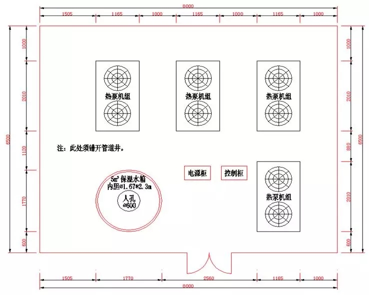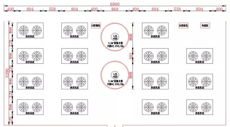 系統三占地面積8m×6.5m,共52m2,共布置4臺機組和1個5.0m3的保溫水箱,機組總制熱量為382kW,分別承擔8、10號樓的供熱負荷。如下圖。