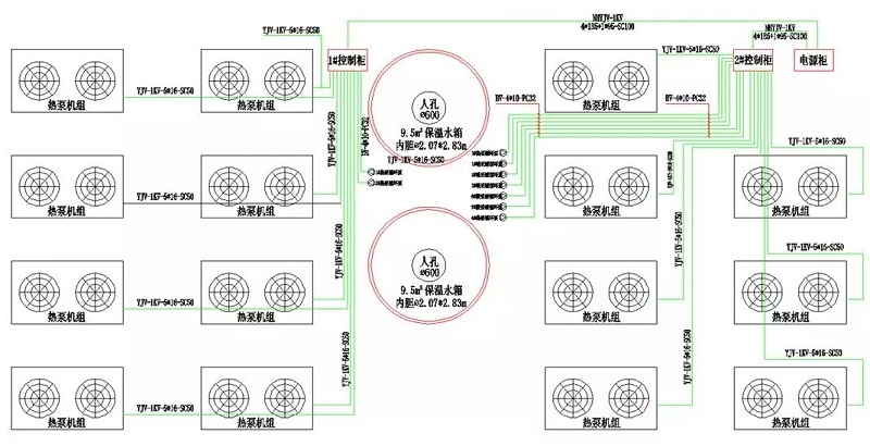 這三個系統集中布置為三塊場地,系統一占地面積17m×80m,共1360m2,共布置15臺機組和2個9.5m3的保溫水箱,機組總制熱量為1432.5kW,分別承擔1、2、4、6、7號樓的供熱負荷。如下圖。