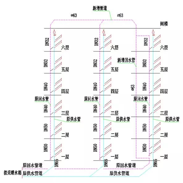 問題剖析:回水管徑存在下大上小,在回水總管從小突然擴大,水阻存在問題;為系統同程,特增加回水總管,但管徑隨支管流量增加未能改變回水總管管徑;排氣閥未裝,運行不熱。