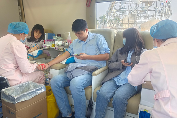 上午9時,東莞市血液中心獻(xiàn)血車準(zhǔn)時到來,在醫(yī)務(wù)人員的指導(dǎo)下,員工認(rèn)真填寫獻(xiàn)血登記表,測血壓、抽血化驗等前期準(zhǔn)備工作,經(jīng)血液檢驗合格后開始無償獻(xiàn)血,整個獻(xiàn)血過程有條不紊、秩序井然。