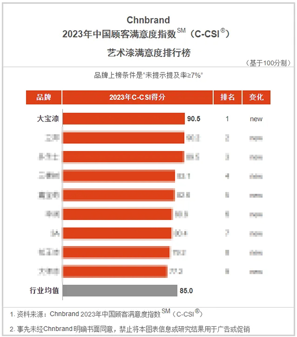 同時,Chnbrand今年首次將藝術(shù)漆納入評價范圍,大寶漆以總分90.5登頂“藝術(shù)漆滿意度排行榜”榜首。